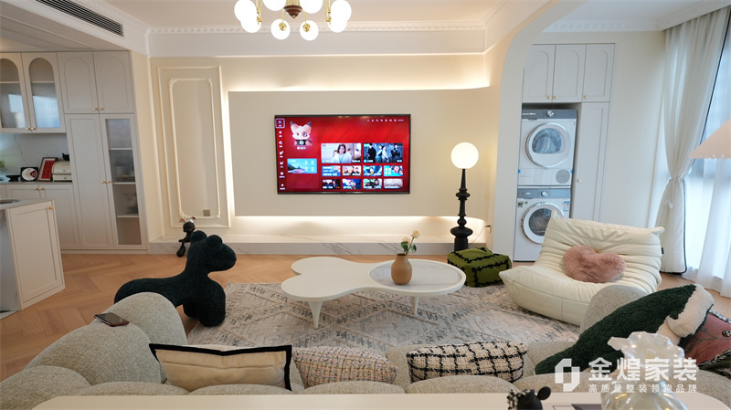 該案例整體色調柔和淡雅,家具造型簡約,線條流暢,同時融入了一些法式元素,如精致的吊燈、優(yōu)雅的拱形門洞和浪漫的裝飾細節(jié),既保留了法式風格的浪漫與優(yōu)雅,又兼具現(xiàn)代簡約的簡潔與實用。
