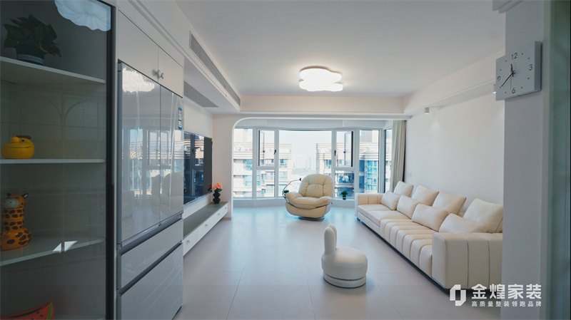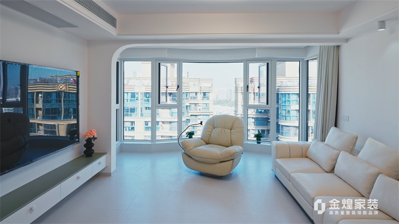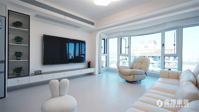 客廳內(nèi),大電視直接掛在墻上,下方配以簡約的電視柜,旁邊擺放著舒適的沙發(fā)和別致的休閑椅,沒有過多的繁雜裝飾,顯得寬敞又明亮。大窗戶的設(shè)計讓室內(nèi)光線充足,進(jìn)一步增強(qiáng)了空間的通透感。