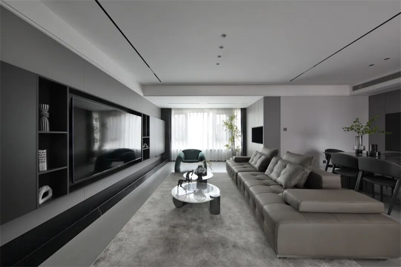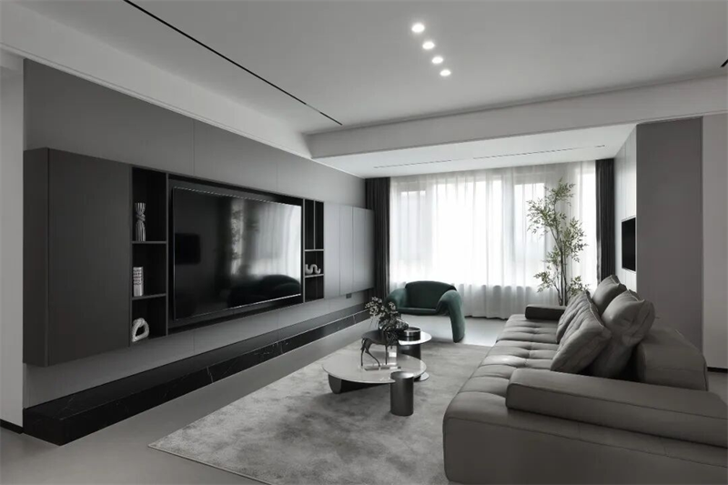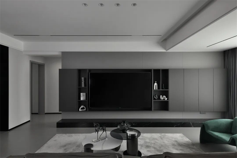 客廳以現(xiàn)代極簡風(fēng)格為基調(diào),整體采用灰黑配色,營造出沉穩(wěn)內(nèi)斂的空間氣質(zhì)。電視背景墻采用整面定制柜體設(shè)計(jì),深灰色啞光面板與開放式格架結(jié)合,嵌入式電視隱藏其中,視覺整潔統(tǒng)一。底部黑色大理石基座提升層次感,兼具裝飾與收納功能。