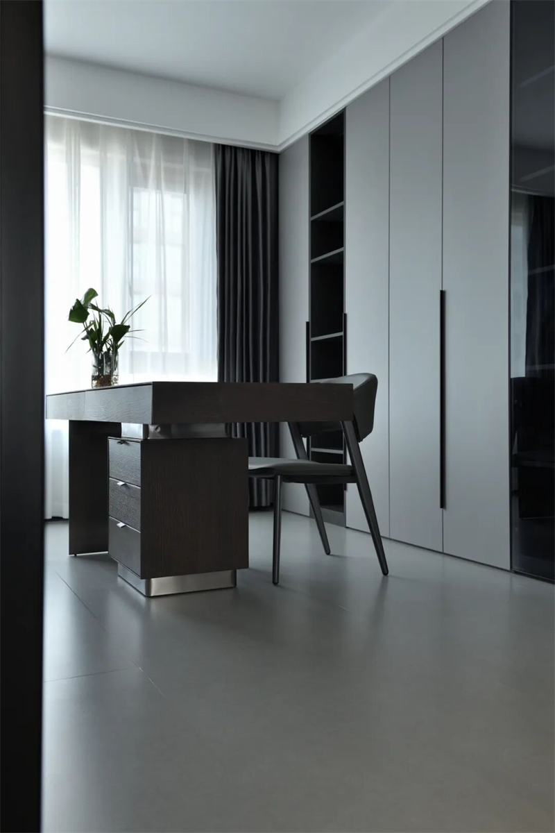 書房空間通透寧靜,以灰白為主調(diào)。黑色金屬框玻璃門隔斷,既保證私密性,又不影響采光與視線通透。室內(nèi)地面鋪設(shè)灰色啞光地磚,墻面簡潔無飾,突出空間的純粹感。整體布局簡潔有序,摒棄多余裝飾,打造一個(gè)安靜、高效、富有質(zhì)感的獨(dú)立思考與工作空間,讓思緒在靜謐中自由流淌。