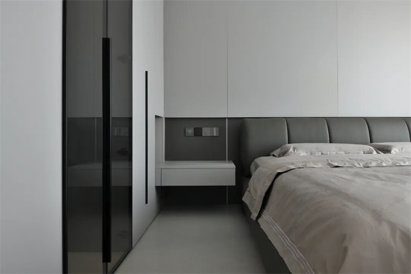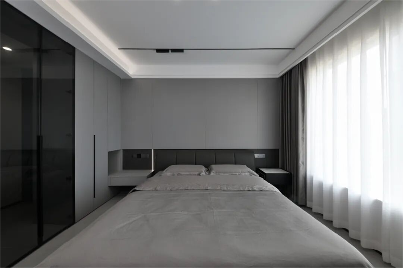 主臥床頭背景墻采用整面定制護(hù)墻板設(shè)計(jì),軟包床頭靠背舒適貼合,搭配淺灰色床品,低調(diào)中透出高級質(zhì)感。兩側(cè)懸空床頭柜設(shè)計(jì)輕盈實(shí)用,內(nèi)置隱藏式燈帶,提供柔和夜光照明,兼顧美觀與功能性。大窗戶配白色紗簾與深色遮光簾,自然光可自由調(diào)節(jié),保證私密性的同時(shí)引入柔和光線。頂部無主燈設(shè)計(jì),結(jié)合線性燈帶與筒燈,營造層次分明的燈光氛圍。