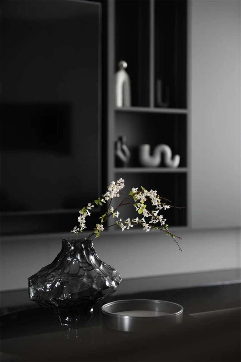 餐廳整體色調(diào)統(tǒng)一,以灰白為主,營造出沉靜而高級的用餐氛圍。黑色大理石餐桌質(zhì)感細(xì)膩,搭配深色皮質(zhì)餐椅,線條簡潔流暢,坐感舒適且富有設(shè)計(jì)感。桌面上擺放透明花瓶與綠植,為冷調(diào)空間增添一抹自然生機(jī)。