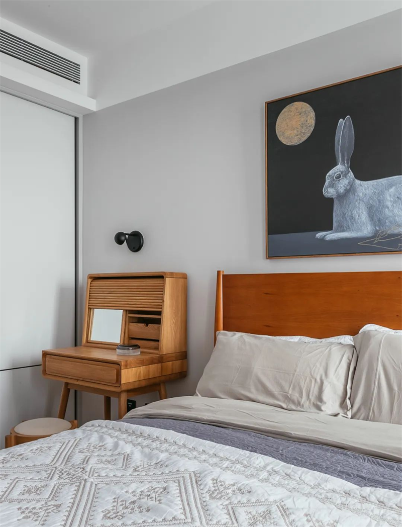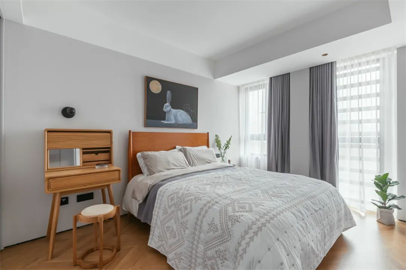 次臥延續(xù)了主臥風(fēng)格,以淡色調(diào)為主,墻面和床上用品都是白色和淺灰色組合。一張舒適的雙人床與床頭柜和木制床架相配,營造出溫馨的休憩氛圍。室內(nèi)擺放了綠植裝飾和北歐風(fēng)格的掛畫,增添了空間的藝術(shù)感。