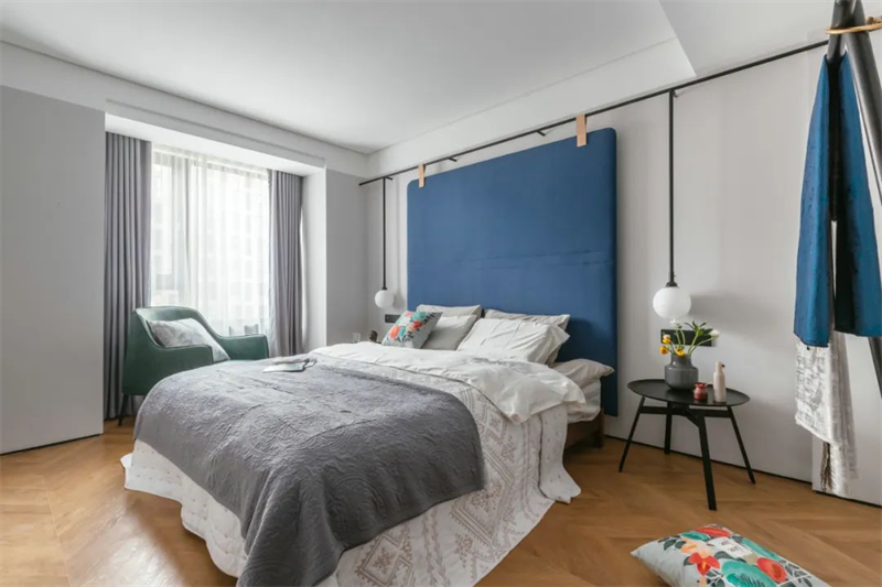 主臥以中性色調(diào)為主,墻面是淡灰色,床頭背景墻則采用了藍(lán)色的布藝面板來裝飾,柔軟舒適的床品,搭配精致的軟裝,打造溫馨愜意的睡眠空間。窗簾選用了透明的白色面料,確保足夠的自然光線進(jìn)入房間,讓房間顯得更加寬敞明亮。