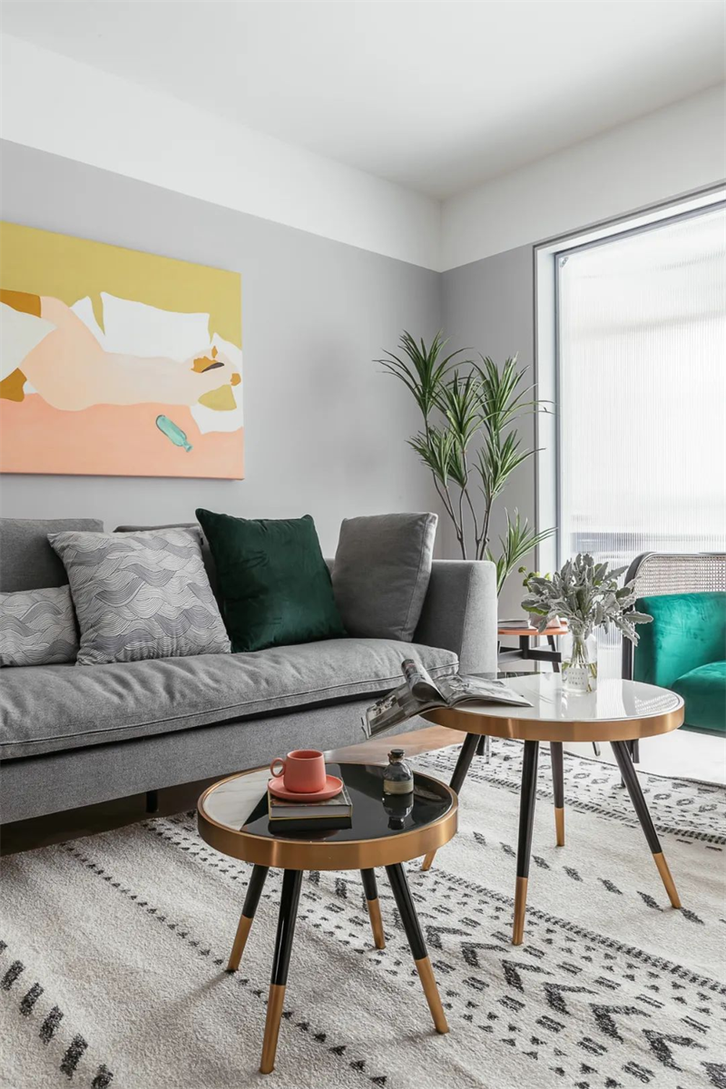 客廳灰白色墻壁和原木色的地板營造出寬敞、明亮的氛圍。大型的落地窗引入大量光線,讓人感覺仿佛置身于大自然中。一張灰色的沙發(fā)搭配著舒適的抱枕,提供了家人和朋友聚集的理想場所。加上豐富且漂亮的綠植點(diǎn)綴,讓空間充滿舒適的自然氣息。