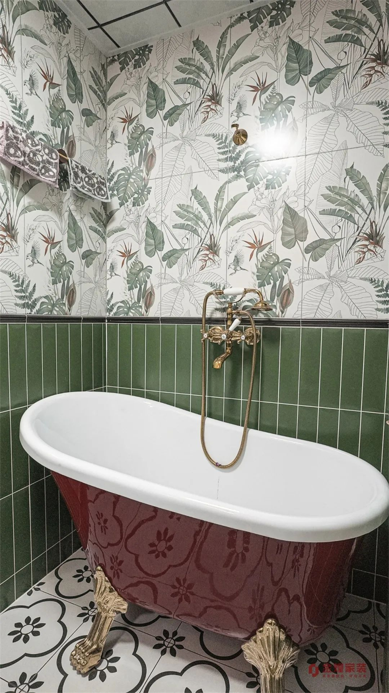 為提高空間利用率,衛(wèi)生間做了干濕分離設(shè)計(jì)。洗手臺(tái)墻面為大面積藝術(shù)壁畫,在鏡面燈的襯托下看起來格外溫馨,使空間更加優(yōu)雅復(fù)古。