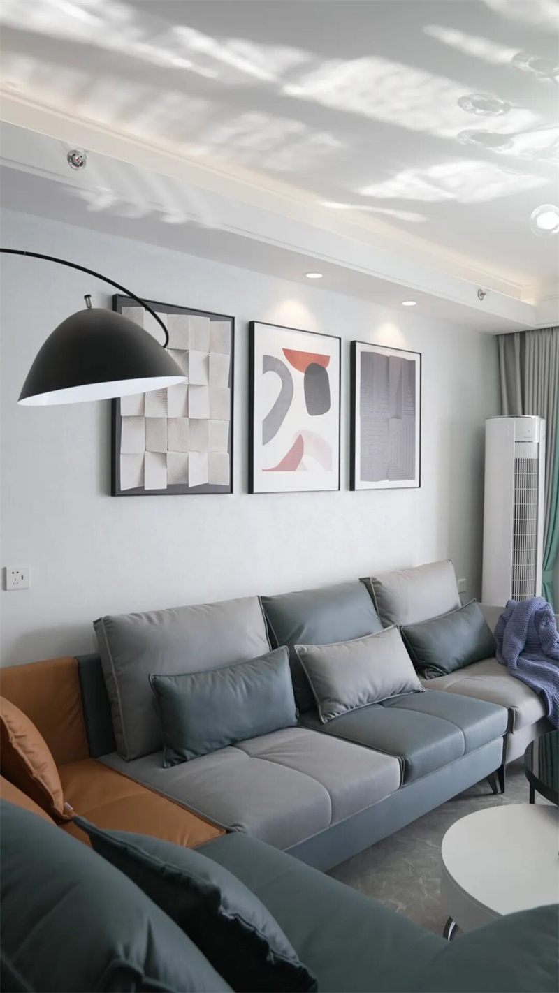 墻面三幅抽象藝術(shù)掛畫(huà)錯(cuò)落有致,為空間注入藝術(shù)氣息,與弧形落地?zé)艄餐蠢粘鋈岷偷墓庥肮?jié)奏。大面積淺色墻漆與通透采光相輔相成,讓整個(gè)空間明亮開(kāi)闊。一旁綠植點(diǎn)綴的陽(yáng)臺(tái)區(qū)域,將自然生機(jī)引入室內(nèi),賦予生活更多呼吸感。