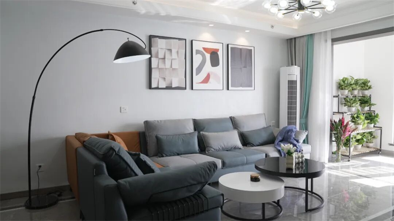 客廳以現(xiàn)代簡(jiǎn)約風(fēng)格為基調(diào),巧妙融合功能與美學(xué),營(yíng)造出舒適而富有格調(diào)的生活空間?;宜{(lán)色與暖棕的拼色沙發(fā),既提升了視覺(jué)層次感,又帶來(lái)溫暖的居家氛圍;搭配圓形金屬茶幾與黑白撞色設(shè)計(jì),簡(jiǎn)潔而不失設(shè)計(jì)感。
