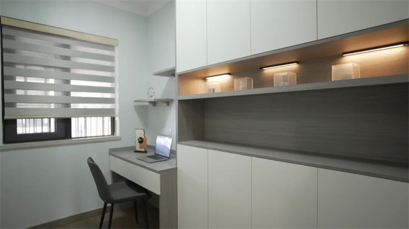 書(shū)房以極簡(jiǎn)設(shè)計(jì)營(yíng)造靜謐專注的氛圍,淺灰藍(lán)墻面搭配木紋與啞光白柜體,構(gòu)建出沉穩(wěn)而不失溫度的視覺(jué)基調(diào)。定制一體式書(shū)桌與儲(chǔ)物柜巧妙結(jié)合,最大化利用空間,兼具收納與辦公功能。開(kāi)放式層架內(nèi)嵌柔和燈帶,不僅提升照明層次,更為空間增添現(xiàn)代感與儀式感。