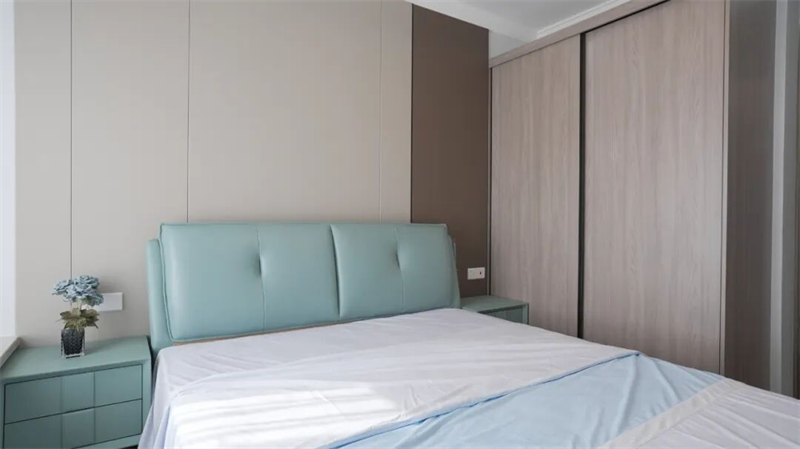 主臥以柔和的色調(diào)與簡(jiǎn)約的設(shè)計(jì)語(yǔ)言,打造一處?kù)o謐而治愈的休憩空間。淺灰藍(lán)皮質(zhì)床頭搭配同色系床品,如晨霧般輕盈舒緩,營(yíng)造出寧?kù)o安逸的睡眠氛圍。背景墻采用拼色設(shè)計(jì),米白與深棕交織,層次分明卻不失整體感,賦予空間低調(diào)的質(zhì)感與溫度。兩側(cè)對(duì)稱的床頭柜延續(xù)色彩呼應(yīng),細(xì)節(jié)處點(diǎn)綴小花藝,增添生活氣息。