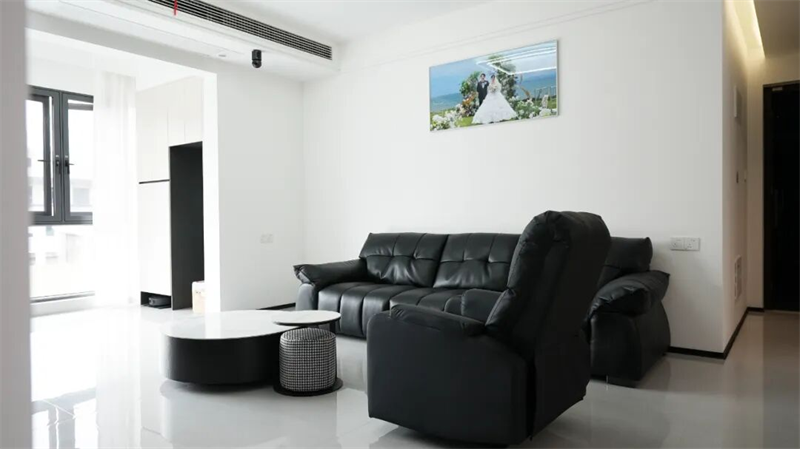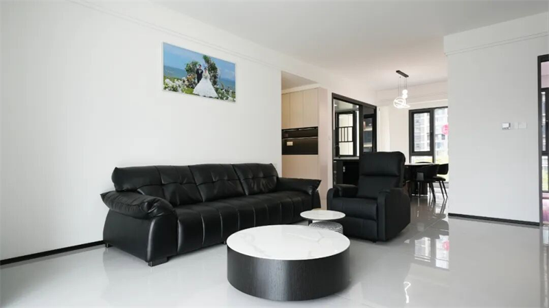 黑色皮質(zhì)沙發(fā)線條流暢,質(zhì)感高級(jí),搭配圓形大理石茶幾與格紋邊幾,形成現(xiàn)代而舒適的會(huì)客區(qū)。通透落地窗將自然光引入室內(nèi),高光地磚映照出明亮通達(dá)的空間氛圍,讓每一寸光線都成為生活的注腳。墻上一幅婚紗照靜靜訴說(shuō)著家的歸屬與情感記憶,而遠(yuǎn)處陽(yáng)臺(tái)的“囍”字貼紙,則為這份理性之美添上一抹溫情的儀式感。