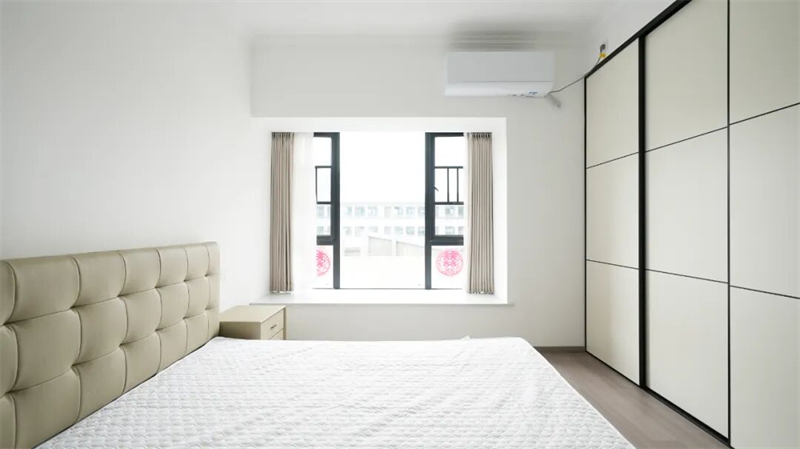 主臥以極簡(jiǎn)語(yǔ)言詮釋靜謐與舒適,是喧囂都市中的一方私密避風(fēng)港。整體采用低飽和色調(diào),米白墻面搭配淺木色地板,營(yíng)造出溫柔而放松的睡眠氛圍。一側(cè)整墻通頂衣柜采用無(wú)把手設(shè)計(jì),線條利落,收納強(qiáng)大又不顯突兀。小型飄窗臺(tái),搭配素雅窗簾,自然光透過(guò)紗簾灑入,讓清晨的第一縷陽(yáng)光成為溫柔喚醒的儀式。