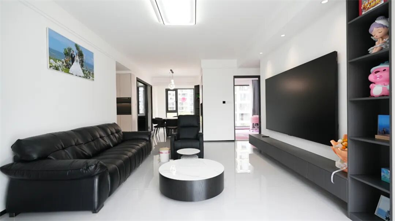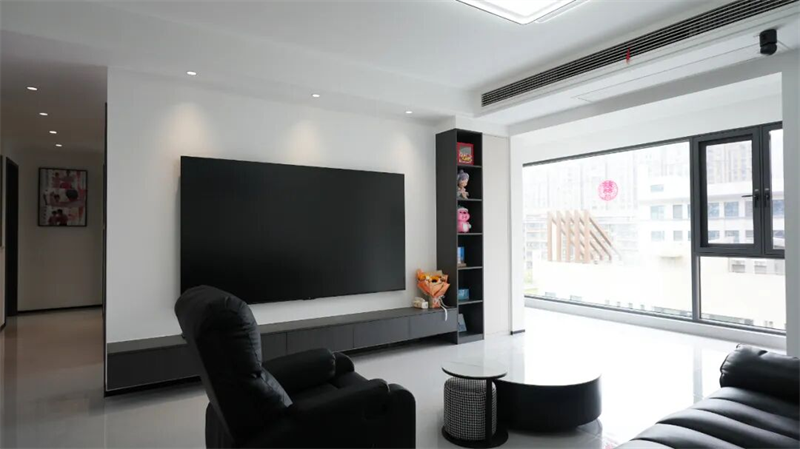 客廳以極簡(jiǎn)美學(xué)為底色,用黑白灰的純粹配比勾勒出干凈利落的空間輪廓。整面墻懸掛的超大尺寸電視,搭配懸浮式深灰色電視柜,營(yíng)造出視覺(jué)上的輕盈與秩序感。一側(cè)嵌入式開(kāi)放式置物架巧妙融入收納與展示功能,陳列著溫馨小物與趣味擺件,在冷靜中注入生活溫度。