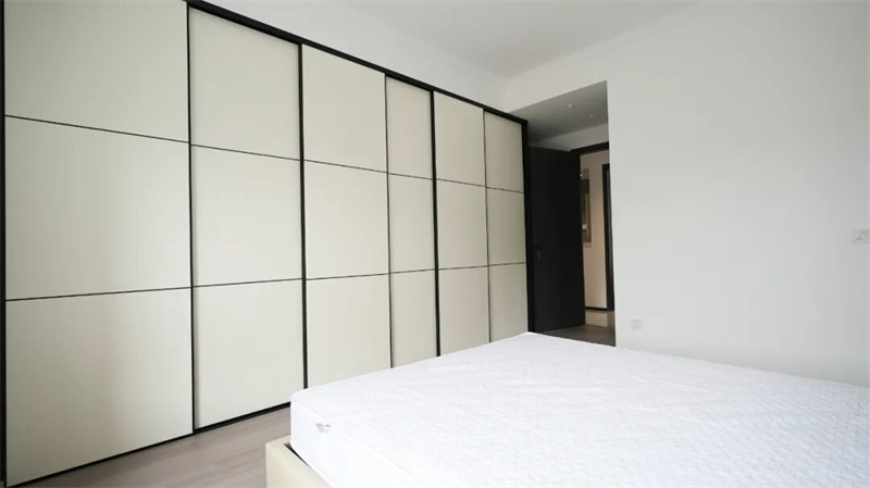 次臥延續(xù)整體現(xiàn)代簡(jiǎn)約風(fēng)格,以克制的色彩與利落的線條營(yíng)造出安靜、整潔的休憩氛圍。整面墻定制衣柜,以淺色柜門配黑色裝飾線條,簡(jiǎn)潔大方又不失設(shè)計(jì)感,有效提升收納能力的同時(shí)保持視覺(jué)清爽。床側(cè)小巧床頭柜實(shí)用而不占空間,滿足日常置物需求。