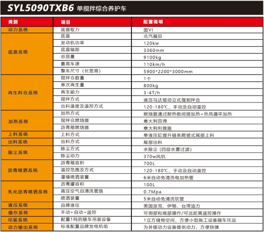 SYL5090TXB6 單攪拌綜合養(yǎng)護(hù)車是一款集現(xiàn)場生產(chǎn)新瀝青混合料、瀝青路面冷料、 舊料、銑刨料 100%現(xiàn)場加熱再生利用 ,熱瀝青灑布、裂紋跟蹤灌縫、乳化瀝青噴灑、為其他裝置提供電力和液壓動力等多種功能于一體的瀝青路面熱再生綜合養(yǎng)護(hù)車??蓪崿F(xiàn)多 場合、多路面的各種類養(yǎng)護(hù)作業(yè) ,養(yǎng)護(hù)修補費用低 ,作業(yè)快捷 ,高效率、節(jié)能環(huán)保性能突 出等特點。適用于市政、? 國省道路、鄉(xiāng)村公路、廠區(qū)、園區(qū)等狹窄區(qū)域瀝青路面小型養(yǎng)護(hù)修補施工。