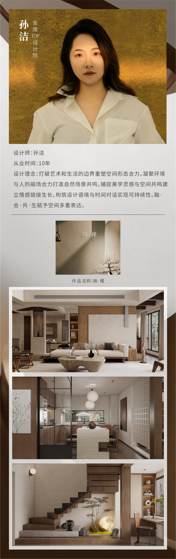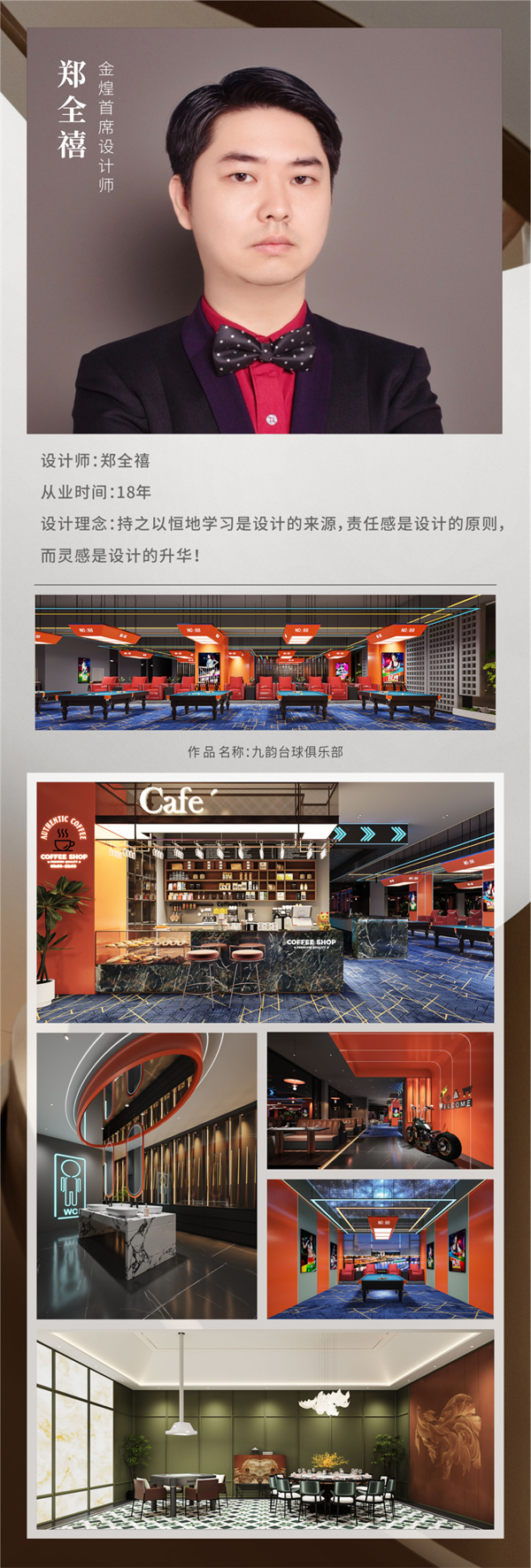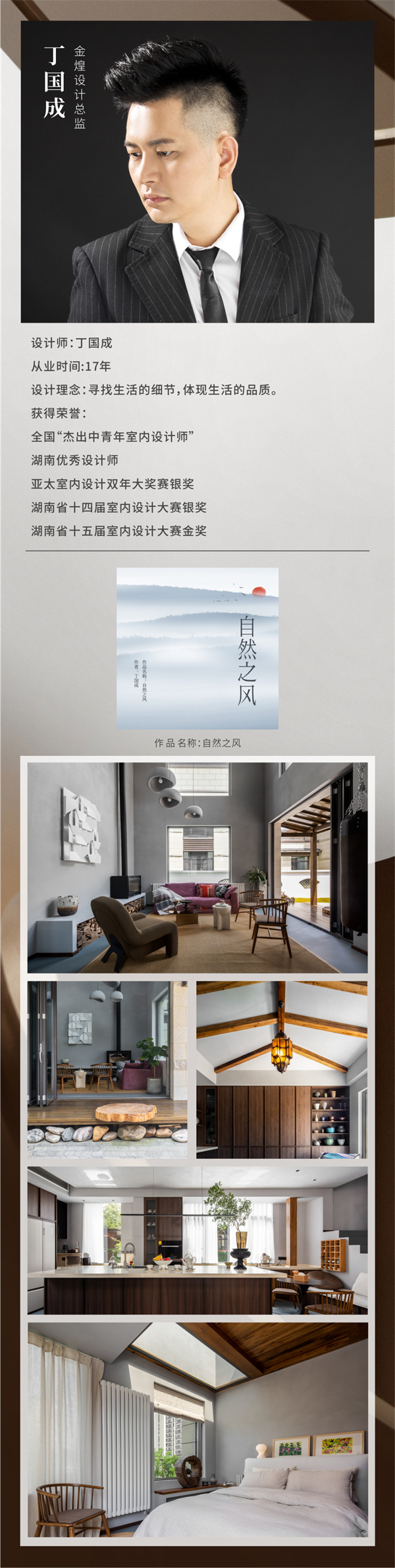 本次大賽以“綠色瀟湘·幸福湖南”為主題,金煌設計總監(jiān)丁國成設計的住宅項目《自然之風》,金煌TOP設計院孫潔設計的麓云國際別墅項目獲得金獎;金煌首席設計師鄭全禧設計的會所項目九韻臺球俱樂部獲得銅獎;孫潔設計的住宅項目《映?槿》獲得優(yōu)秀獎。橙果墅裝主理人孫香設計的住宅項目《幽幽歲月》獲得金獎,《明暗至簡》獲得銅獎。金煌也喜獲優(yōu)秀組織獎。