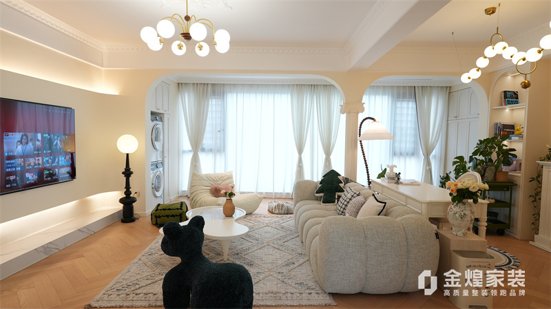 該案例整體色調柔和淡雅,家具造型簡約,線條流暢,同時融入了一些法式元素,如精致的吊燈、優(yōu)雅的拱形門洞和浪漫的裝飾細節(jié),既保留了法式風格的浪漫與優(yōu)雅,又兼具現(xiàn)代簡約的簡潔與實用。