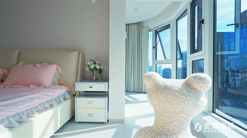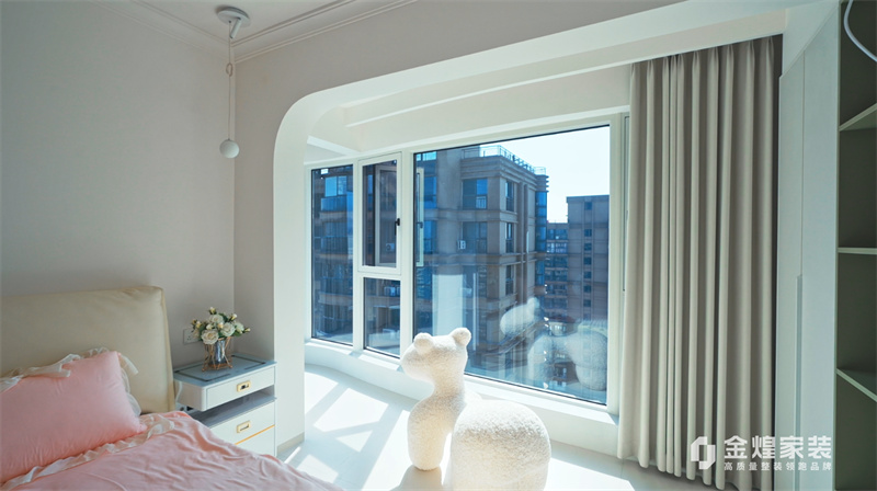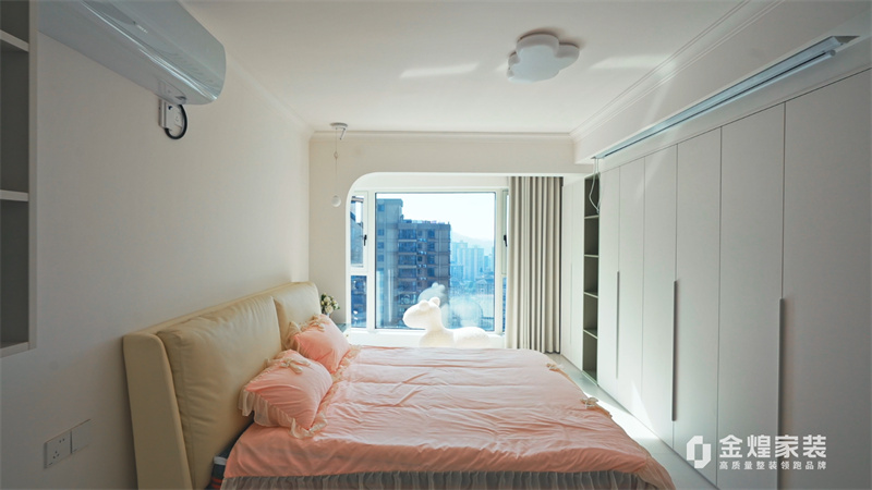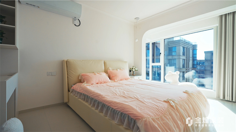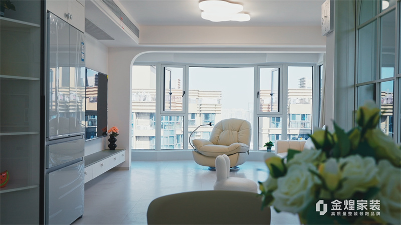 客廳內(nèi),大電視直接掛在墻上,下方配以簡約的電視柜,旁邊擺放著舒適的沙發(fā)和別致的休閑椅,沒有過多的繁雜裝飾,顯得寬敞又明亮。大窗戶的設(shè)計讓室內(nèi)光線充足,進(jìn)一步增強(qiáng)了空間的通透感。