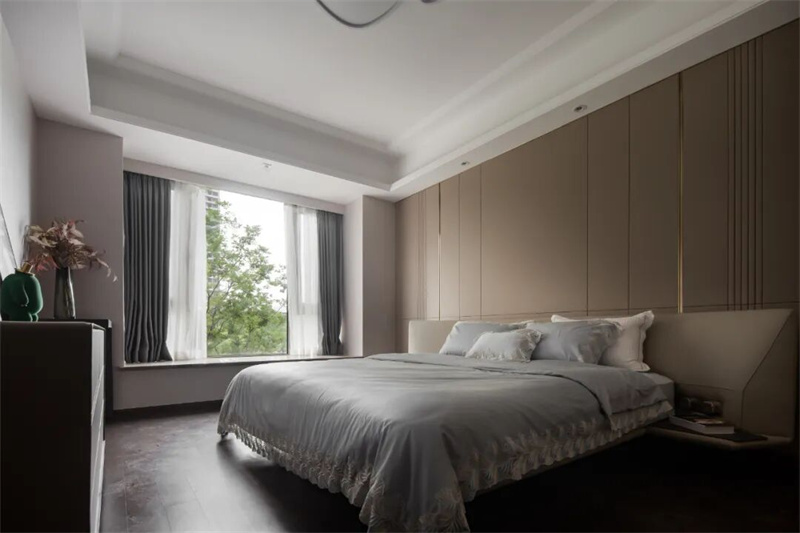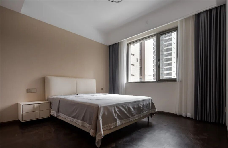 在臥室中,采用柔和而中性的色彩,如米白色、灰色以及淡藍(lán)色。這些顏色能夠?yàn)榕P室營造出一種寧靜而放松的氛圍。同時,選擇原木色地板,并搭配中性色的床品和窗簾,營造出一個宜人的睡眠空間。