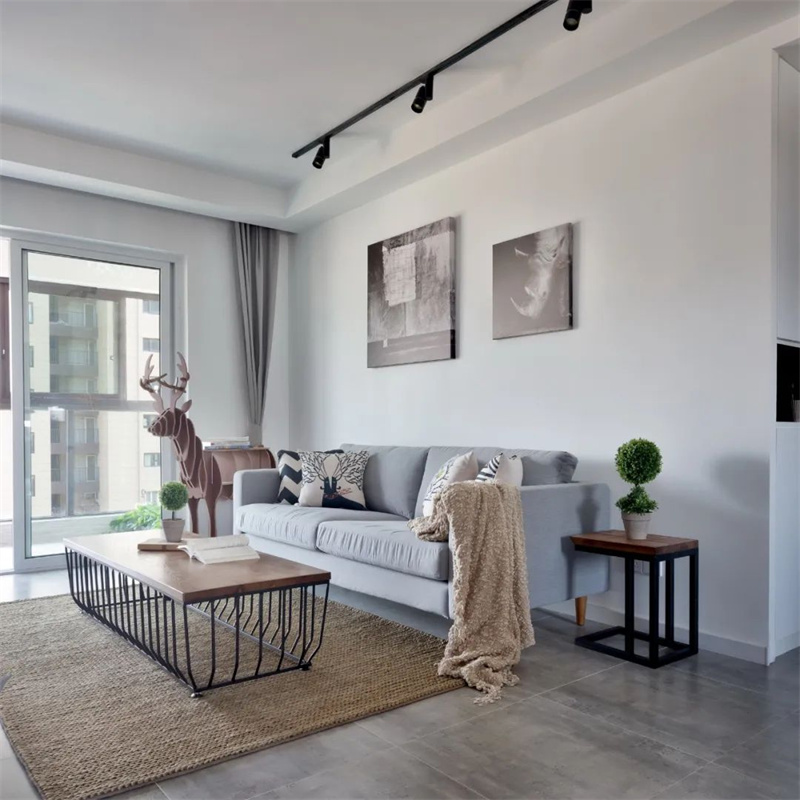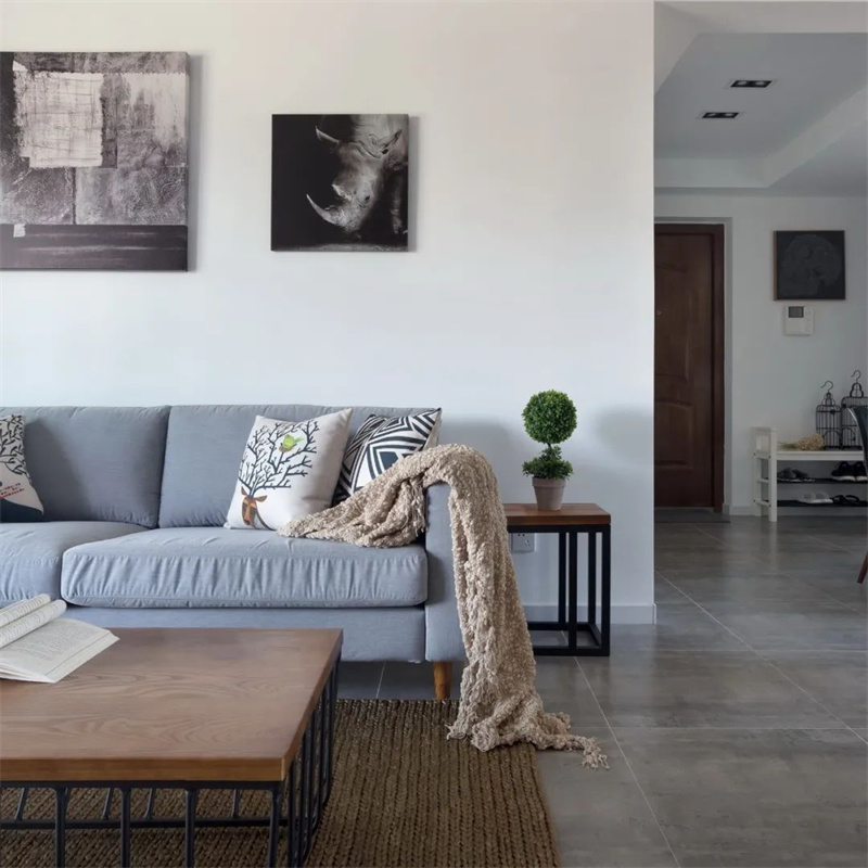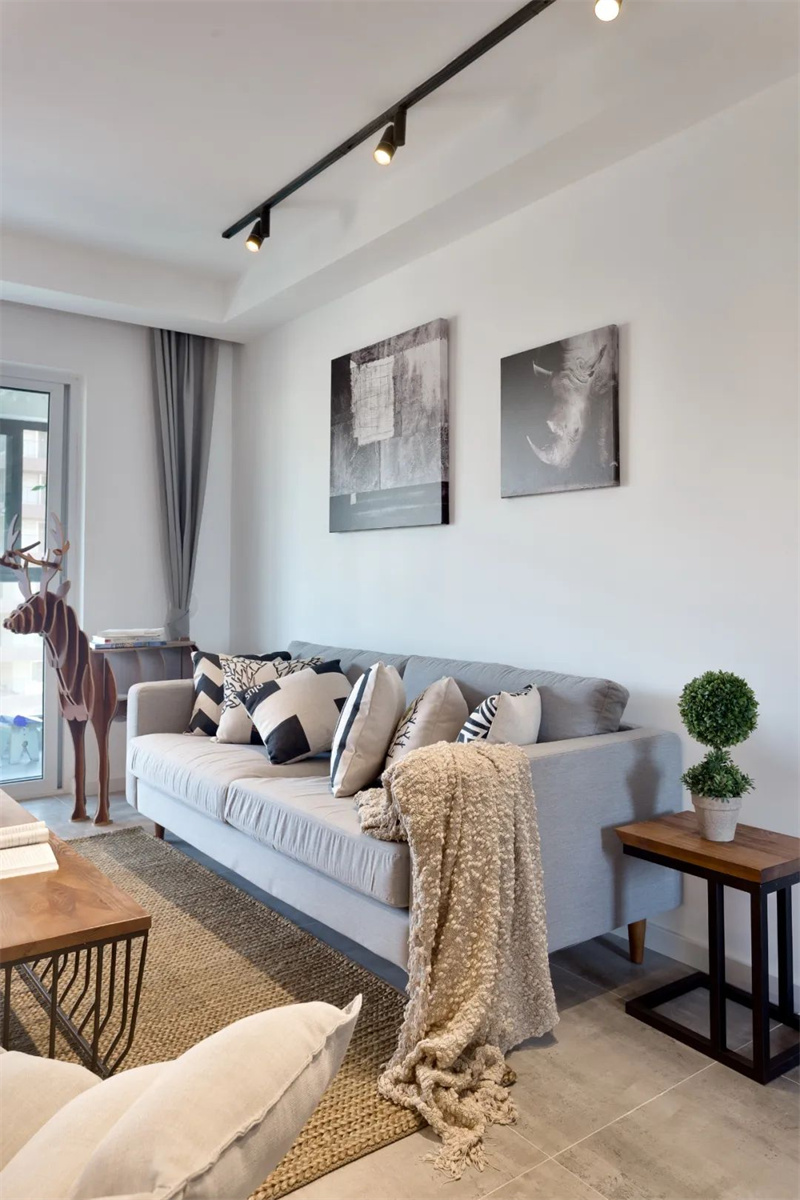 客廳整體采用了白色墻壁,使整個(gè)空間更加明亮和開放?;疑卮u增加了室內(nèi)的深度和溫暖感。家具采用原木色,強(qiáng)調(diào)自然元素。舒適的灰色沙發(fā)和裝飾枕頭為客廳增添了溫馨感。墻上的裝飾物和藝術(shù)品展示著北歐設(shè)計(jì)的獨(dú)特元素,為空間增添了個(gè)性。