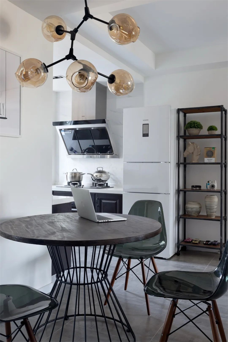 廚房臨窗而設(shè),讓整個(gè)廚房保持明亮干爽的空間,以白色大理石紋理墻磚+灰色地磚組合,結(jié)合深色定制櫥柜,在U型的操作臺(tái)下,裝扮出了一個(gè)舒適時(shí)尚的烹飪空間。