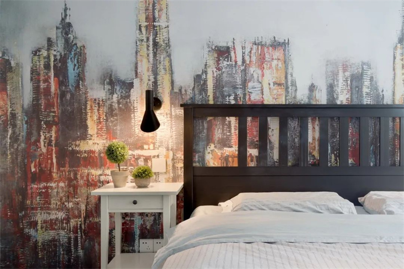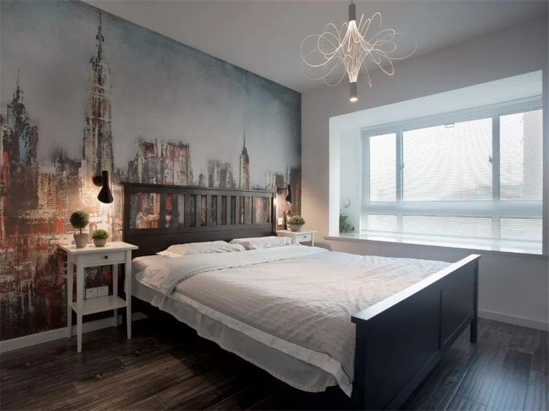 主臥室以白色墻面為主,床頭背景墻繪制大幅藝術(shù)畫,為空間增添藝術(shù)氣息。大窗戶帶來了足夠的自然光線,使臥室更加明亮。簡(jiǎn)約的原木床加上深色地板與白色飄窗臺(tái),簡(jiǎn)簡(jiǎn)單單的空間,充滿了輕松與自然的質(zhì)感。