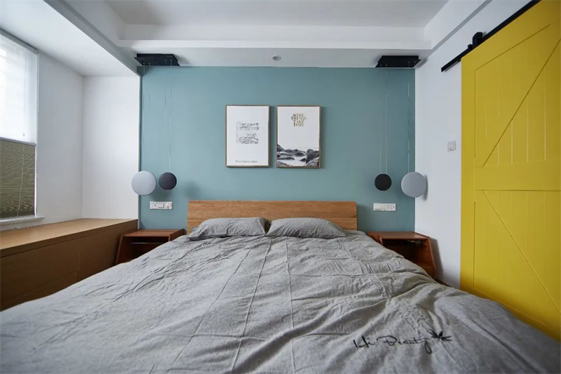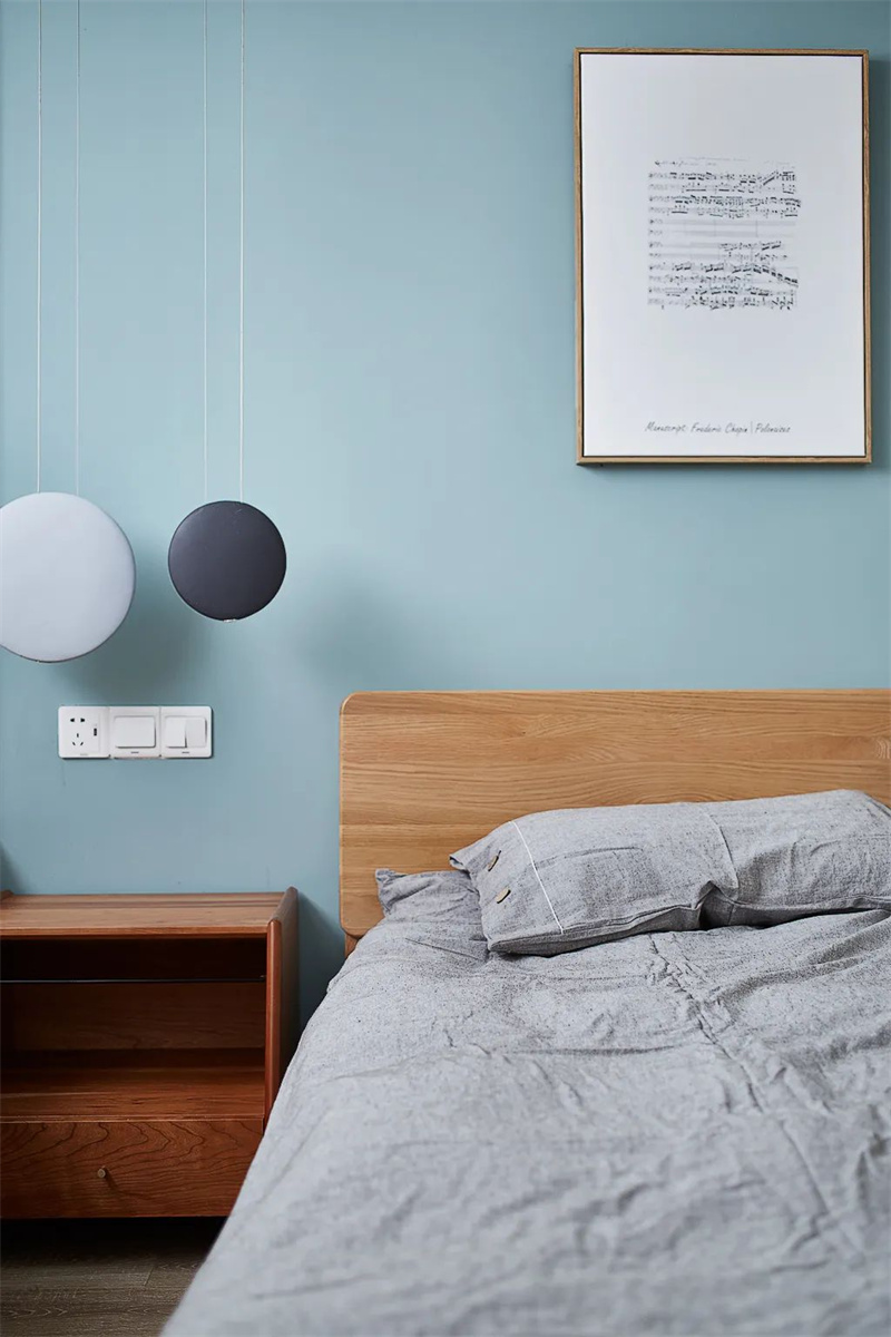 主臥室墻面是明亮的白色,藍色的床頭背景與灰色的床品組合,加上原木地板和實木家具,給空間帶來清新的自然感。主臥室的照明設(shè)計考慮到了夜間舒適的用光需求,包括床頭臺燈和壁燈,打造完美的休憩空間。