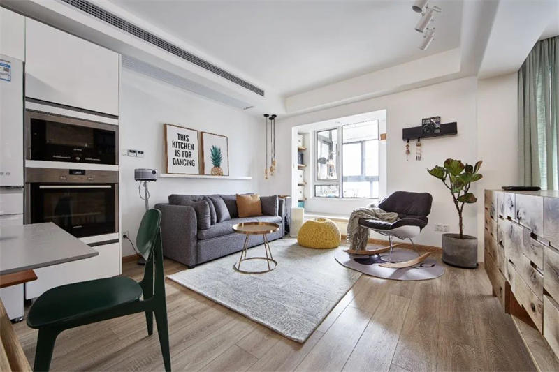 客廳是本案的亮點,白色墻壁為空間提供了明亮的背景??蛷d的地板是原木色,賦予了房間自然的溫暖感。墻上裝飾著一些抽象的藝術(shù)畫作,為空間帶來些許藝術(shù)氛圍。整個客廳的設(shè)計強調(diào)了開放感和清晰的線條,讓人感到寬敞和時尚。