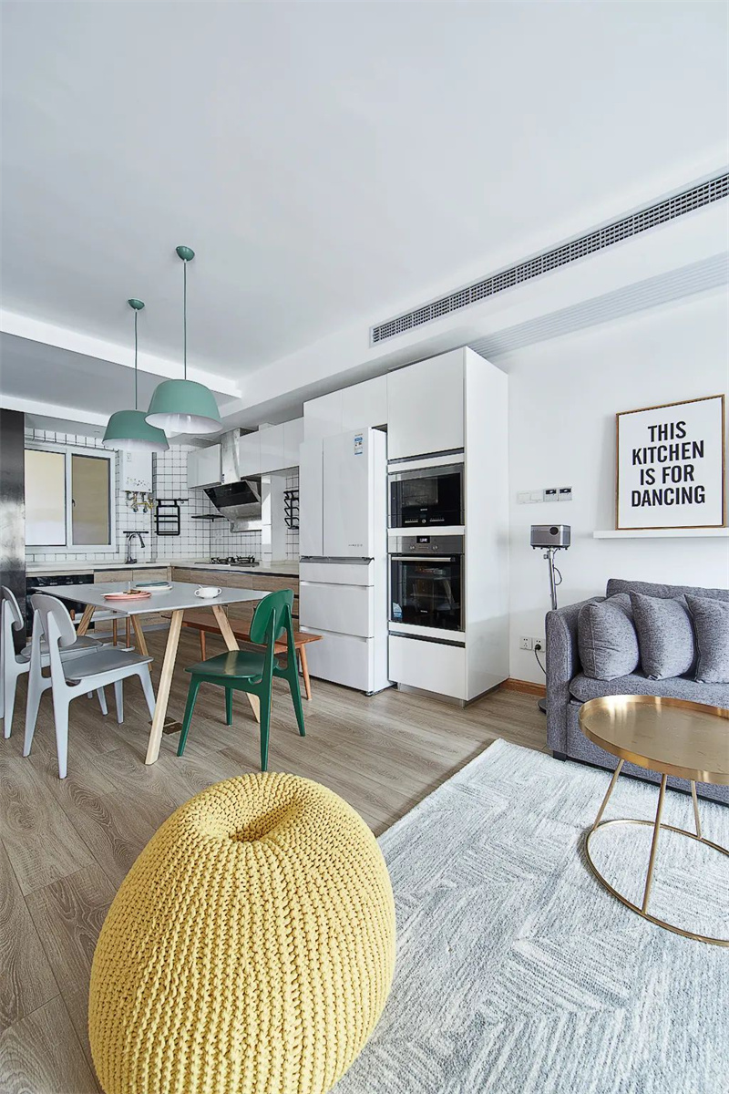 餐廳延續(xù)了客廳的設(shè)計,使用白色和灰色為主要色調(diào)。餐桌采用了簡潔的灰白色設(shè)計,配合原木色地板,為用餐區(qū)帶來了舒適感。頂部懸掛著一組現(xiàn)代感的吊燈,為餐區(qū)提供了柔和的照明