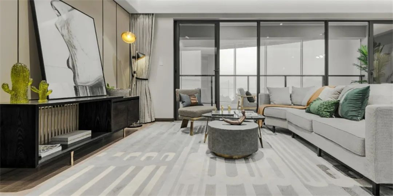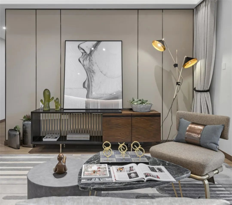 本案采用灰白中性色搭配原木地板為主色調(diào),營造清新簡約的空間氛圍。室內(nèi)家具選用了簡約設(shè)計(jì)的灰白色系,搭配金屬材質(zhì)的細(xì)節(jié)裝飾與綠植,使整體空間更顯現(xiàn)現(xiàn)代感和奢華感。