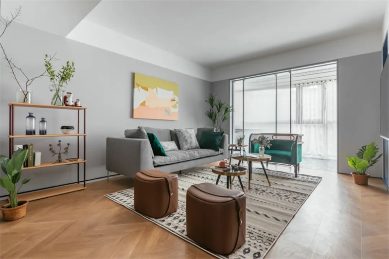 客廳灰白色墻壁和原木色的地板營造出寬敞、明亮的氛圍。大型的落地窗引入大量光線,讓人感覺仿佛置身于大自然中。一張灰色的沙發(fā)搭配著舒適的抱枕,提供了家人和朋友聚集的理想場所。加上豐富且漂亮的綠植點(diǎn)綴,讓空間充滿舒適的自然氣息。