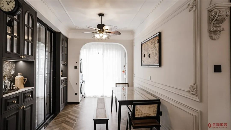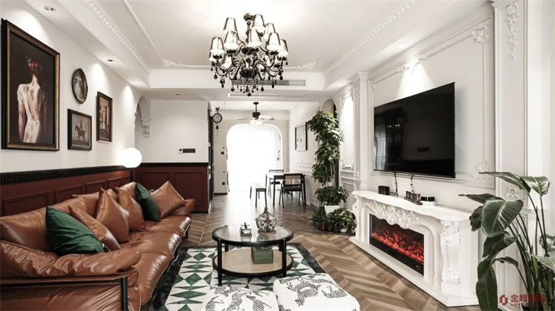 全屋整體配色以大面積的墨綠與棕咖調(diào)相結(jié)合,再搭配具有復(fù)古韻味的家具。在精致的燈飾映襯下,法式情調(diào)和復(fù)古氛圍在空間中得以巧妙融合。寬廣的飄窗帶來極佳的采光,使整個(gè)公共區(qū)域充滿通透感,舒適明亮。