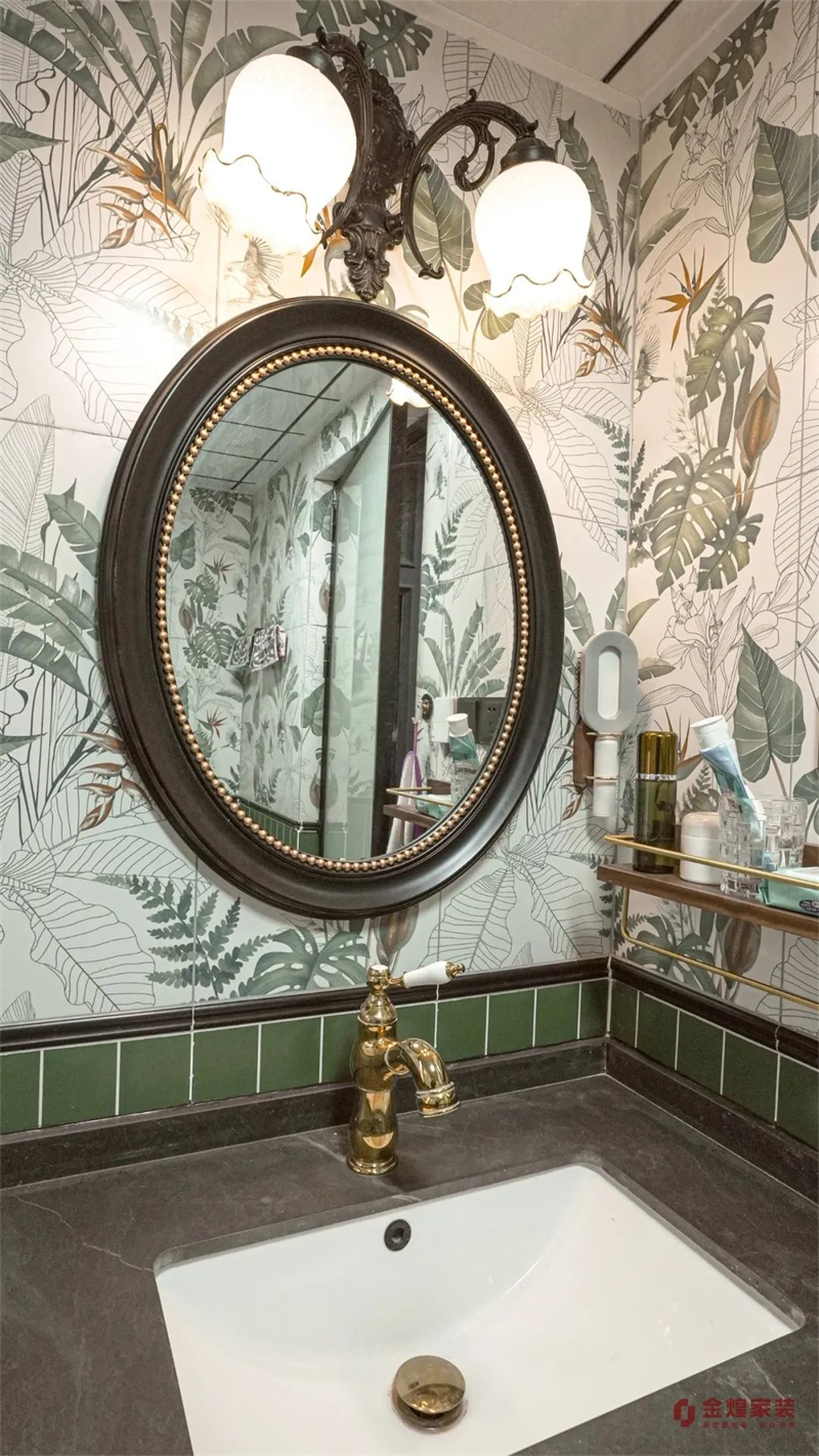 為提高空間利用率,衛(wèi)生間做了干濕分離設(shè)計(jì)。洗手臺(tái)墻面為大面積藝術(shù)壁畫,在鏡面燈的襯托下看起來格外溫馨,使空間更加優(yōu)雅復(fù)古。