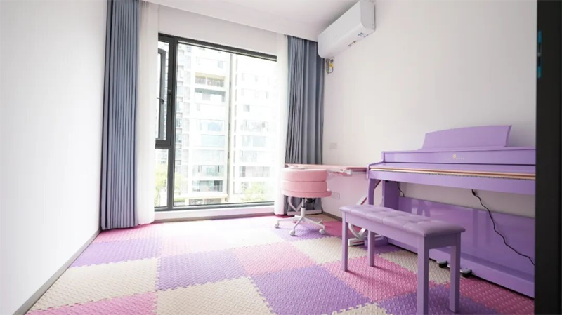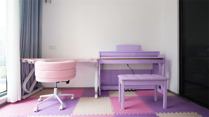 書(shū)房整體以柔和的粉紫系為主調(diào),一整面落地窗引入充足自然光,搭配灰藍(lán)色窗簾,既保證采光又調(diào)節(jié)光線柔和度,為專注學(xué)習(xí)提供舒適環(huán)境。房間中央擺放著一架淡紫色電鋼琴,配同色系琴凳,優(yōu)雅中透著可愛(ài),激發(fā)孩子對(duì)音樂(lè)的熱愛(ài);一側(cè)是可升降書(shū)桌,搭配柔軟粉色毛絨椅,科學(xué)護(hù)眼又兼顧舒適,滿足書(shū)寫、閱讀與作業(yè)需求。