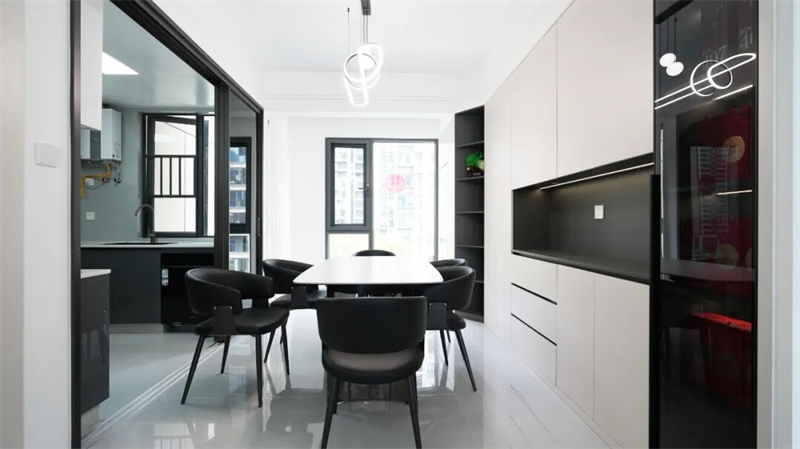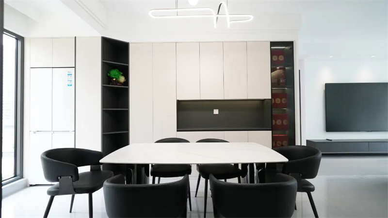 餐廳延續(xù)整體現(xiàn)代簡(jiǎn)約的基調(diào),一張大尺寸巖板餐桌搭配六把黑色皮質(zhì)餐椅,線條利落、質(zhì)感高級(jí),既滿足家庭聚餐需求,也兼顧日常生活的儀式感。背景墻定制整面儲(chǔ)物柜,白色柜門與深色開(kāi)放式格架形成視覺(jué)對(duì)比,兼具收納與展示功能??看安季肿屪匀还獬浞譃⒙洌嵘貌蜁r(shí)的通透感與舒適度。