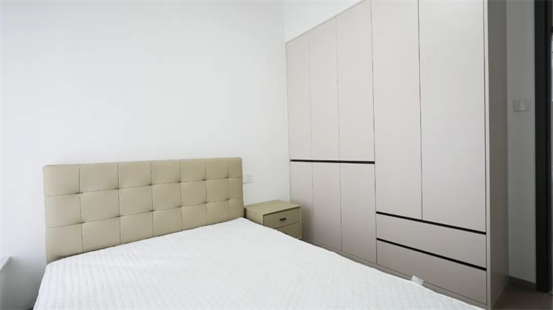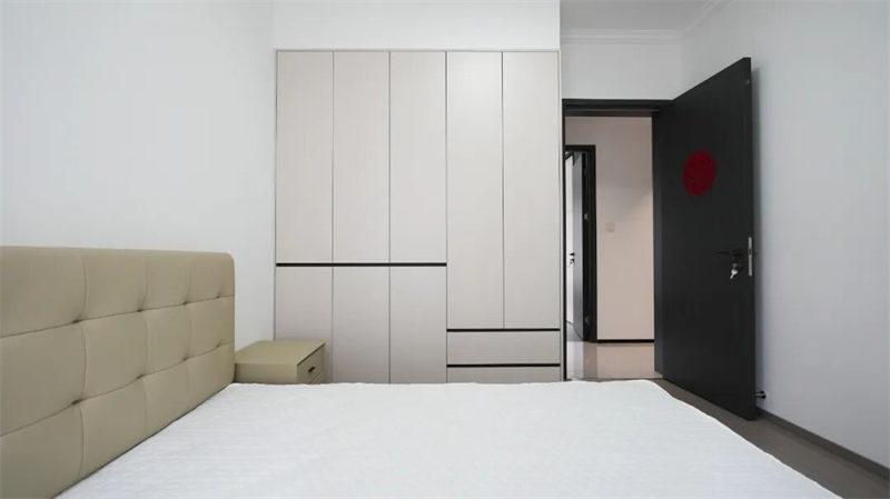 主臥以極簡(jiǎn)語(yǔ)言詮釋靜謐與舒適,是喧囂都市中的一方私密避風(fēng)港。整體采用低飽和色調(diào),米白墻面搭配淺木色地板,營(yíng)造出溫柔而放松的睡眠氛圍。一側(cè)整墻通頂衣柜采用無(wú)把手設(shè)計(jì),線條利落,收納強(qiáng)大又不顯突兀。小型飄窗臺(tái),搭配素雅窗簾,自然光透過(guò)紗簾灑入,讓清晨的第一縷陽(yáng)光成為溫柔喚醒的儀式。
