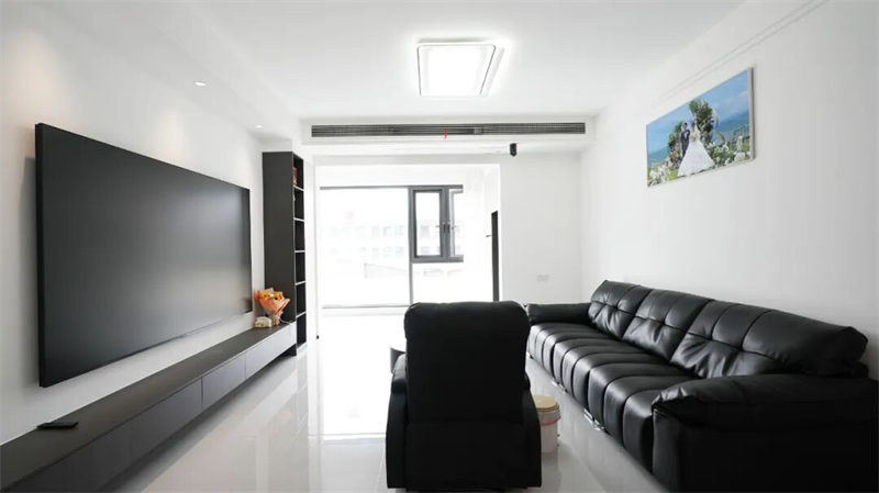 客廳以極簡(jiǎn)美學(xué)為底色,用黑白灰的純粹配比勾勒出干凈利落的空間輪廓。整面墻懸掛的超大尺寸電視,搭配懸浮式深灰色電視柜,營(yíng)造出視覺(jué)上的輕盈與秩序感。一側(cè)嵌入式開(kāi)放式置物架巧妙融入收納與展示功能,陳列著溫馨小物與趣味擺件,在冷靜中注入生活溫度。