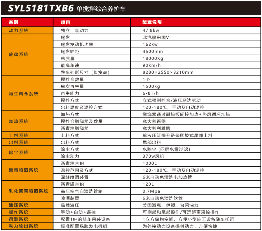 SYL5181TXB6 單攪拌綜合養(yǎng)護(hù)車是一款集現(xiàn)場生產(chǎn)新瀝青混合料、瀝青路面冷料、 舊料、銑刨料100%現(xiàn)場加熱再生利用 ,熱瀝青灑布、裂紋跟蹤灌縫、乳化瀝青噴灑、為其他裝置提供電力和液壓動力等多種功能于一體的瀝青路面熱再生綜合養(yǎng)護(hù)車??蓪崿F(xiàn)多場合、多路面的各種類養(yǎng)護(hù)作業(yè) ,養(yǎng)護(hù)修補(bǔ)費(fèi)用低 ,作業(yè)快捷 ,高效率、節(jié)能環(huán)保性能突出等特點。適用于遠(yuǎn)郊較寬闊區(qū)域中大施工量和高速公路的修補(bǔ)施工。